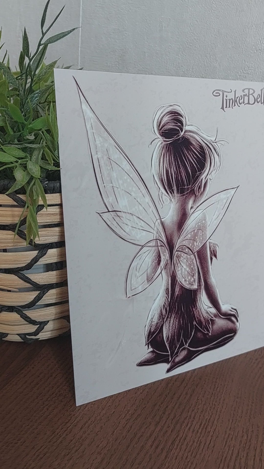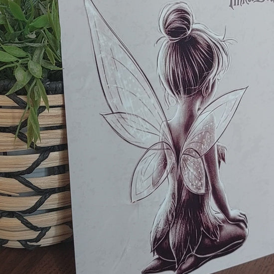 Elle représente une jeune fée vue de dos, assise paisiblement, ses ailes délicates scintillant dans un ton sépia élégant.