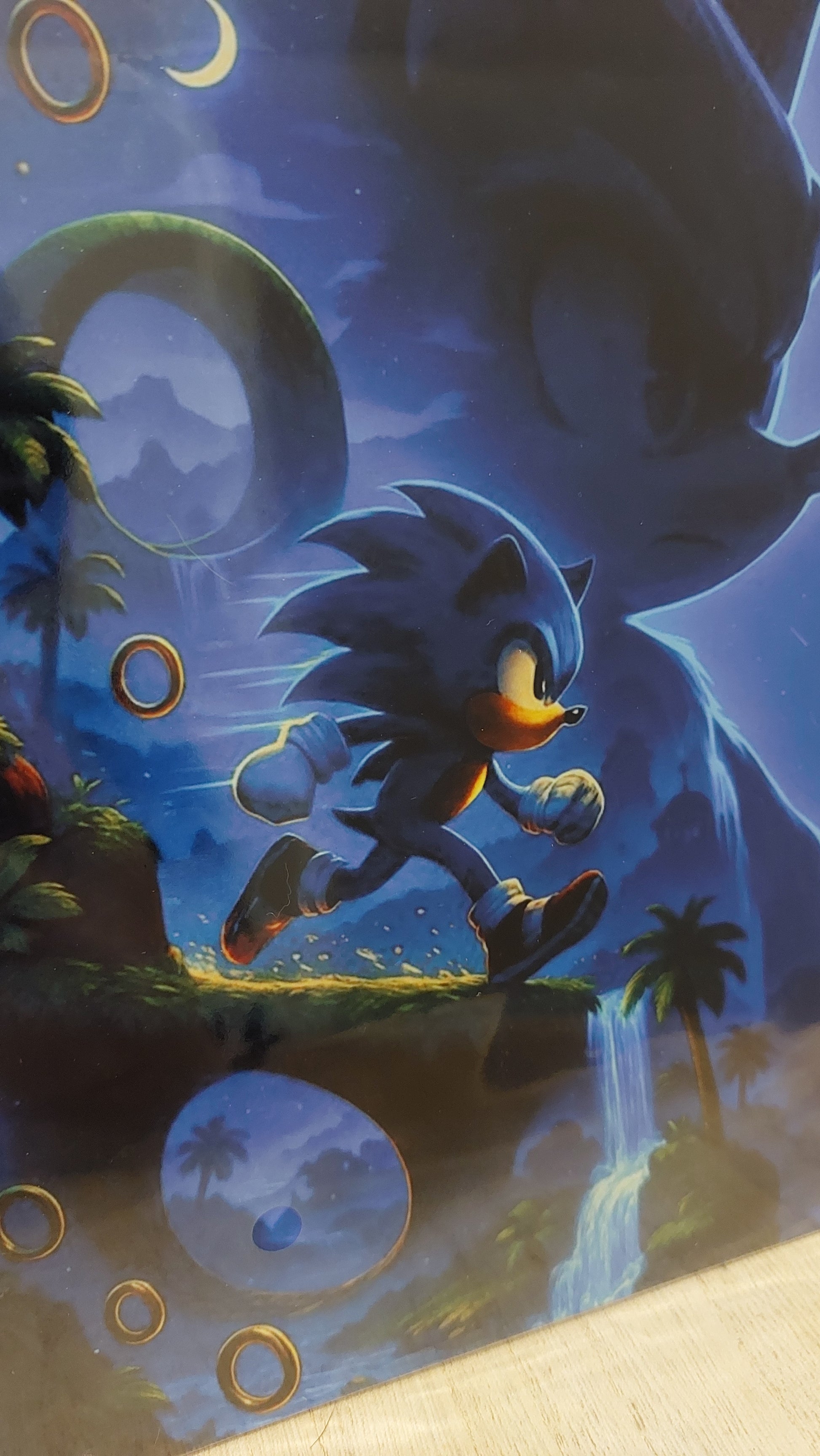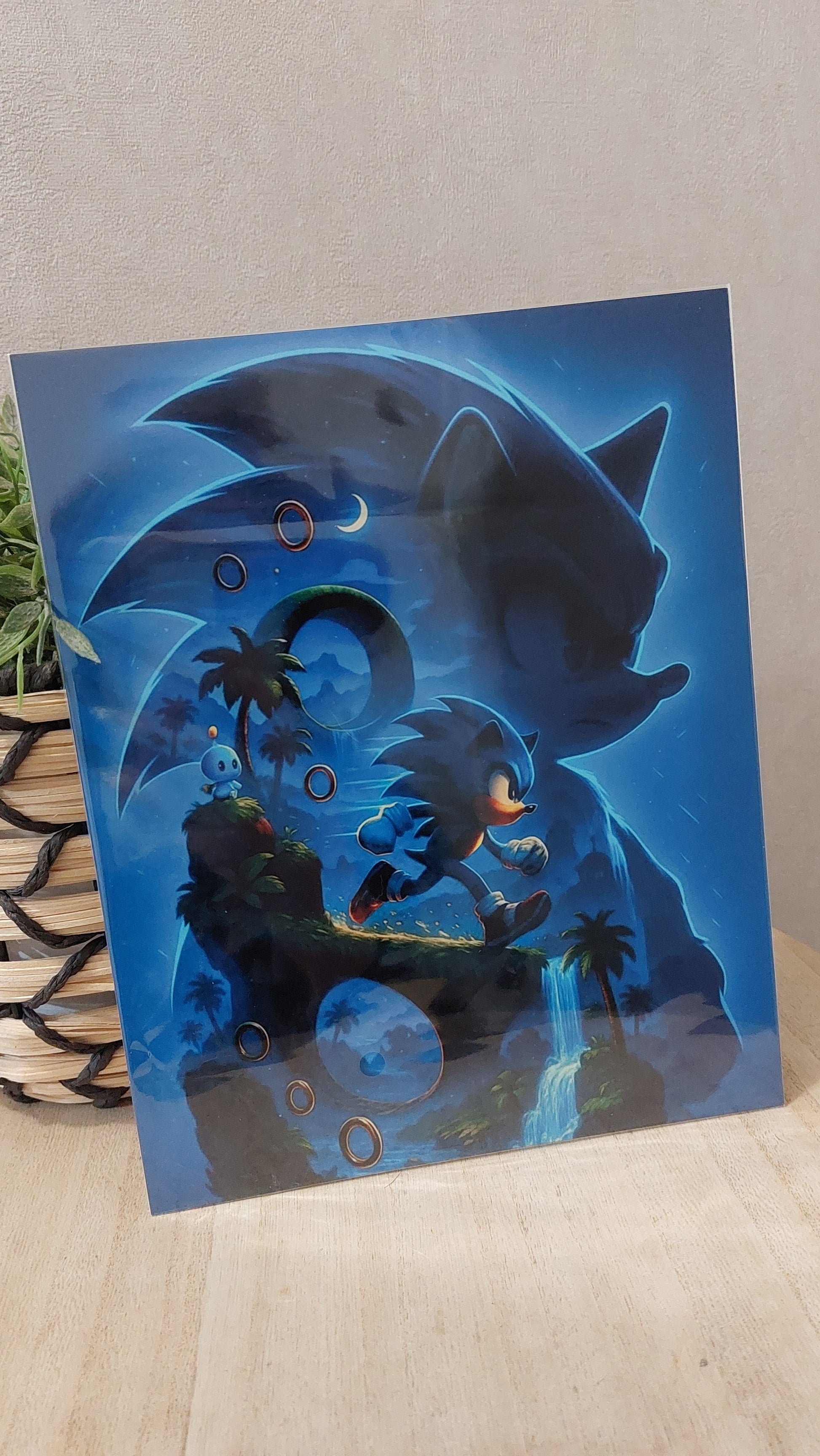 Plonge dans une aventure nocturne et trépidante avec cette plaque décorative en métal. Le visuel met en scène un petit hérisson bleu courant à toute vitesse sur une île tropicale. Autour de lui flottent des anneaux dorés, des palmiers et des loopings emblématiques tandis qu’une cascade se jette dans une lagune étincelante. En arrière‑plan, la silhouette gigantesque du héros veillant sur l’horizon confère une ambiance épique, et un petit compagnon rondouillet observe la scène depuis un rocher. Les teintes bleutées et les éclats de lumière restituent l’énergie et la magie d’une aventure supersonique.